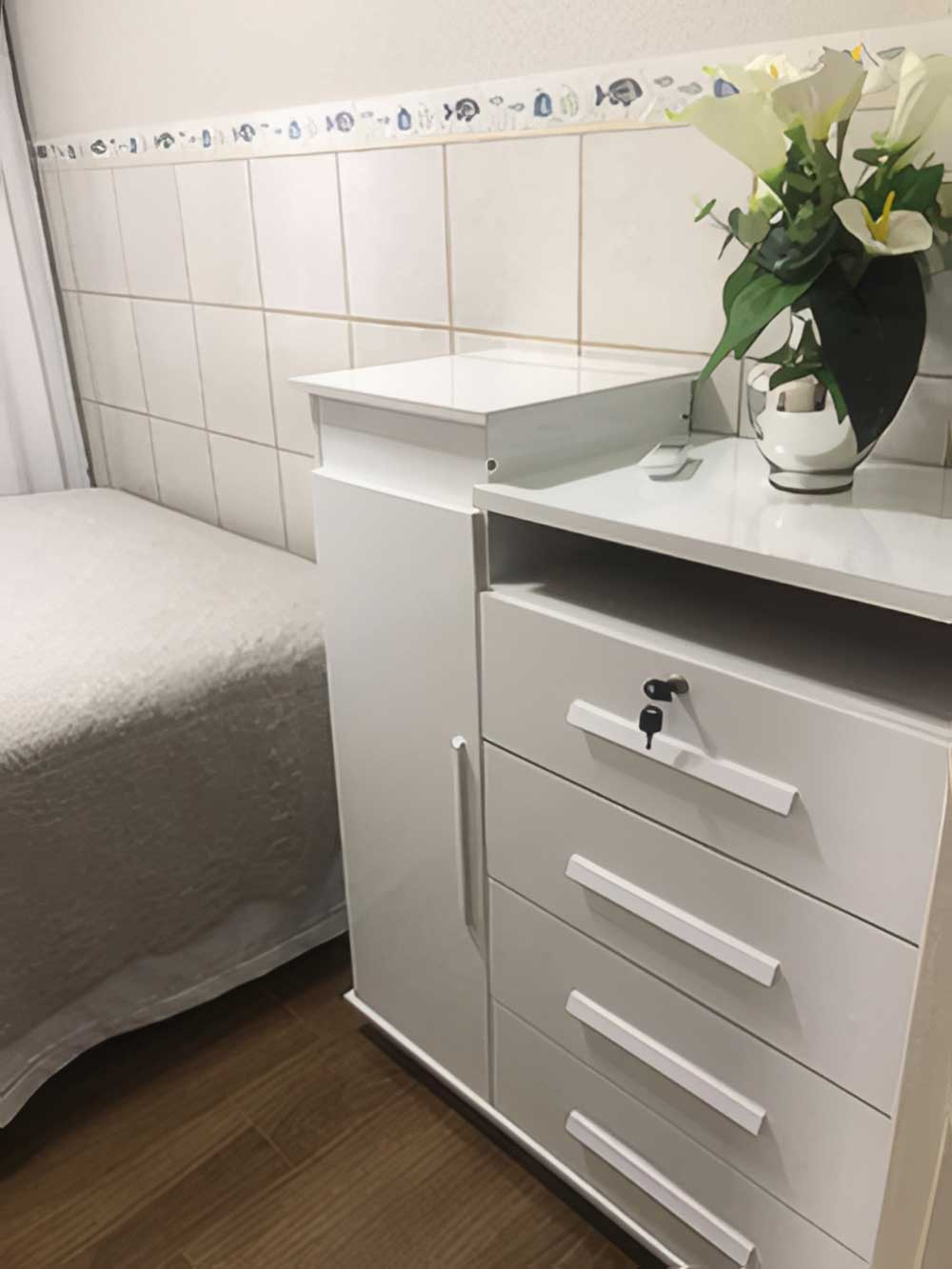 - Terceiro quarto: Uma cama de casal e uma cômoda para guardar roupas